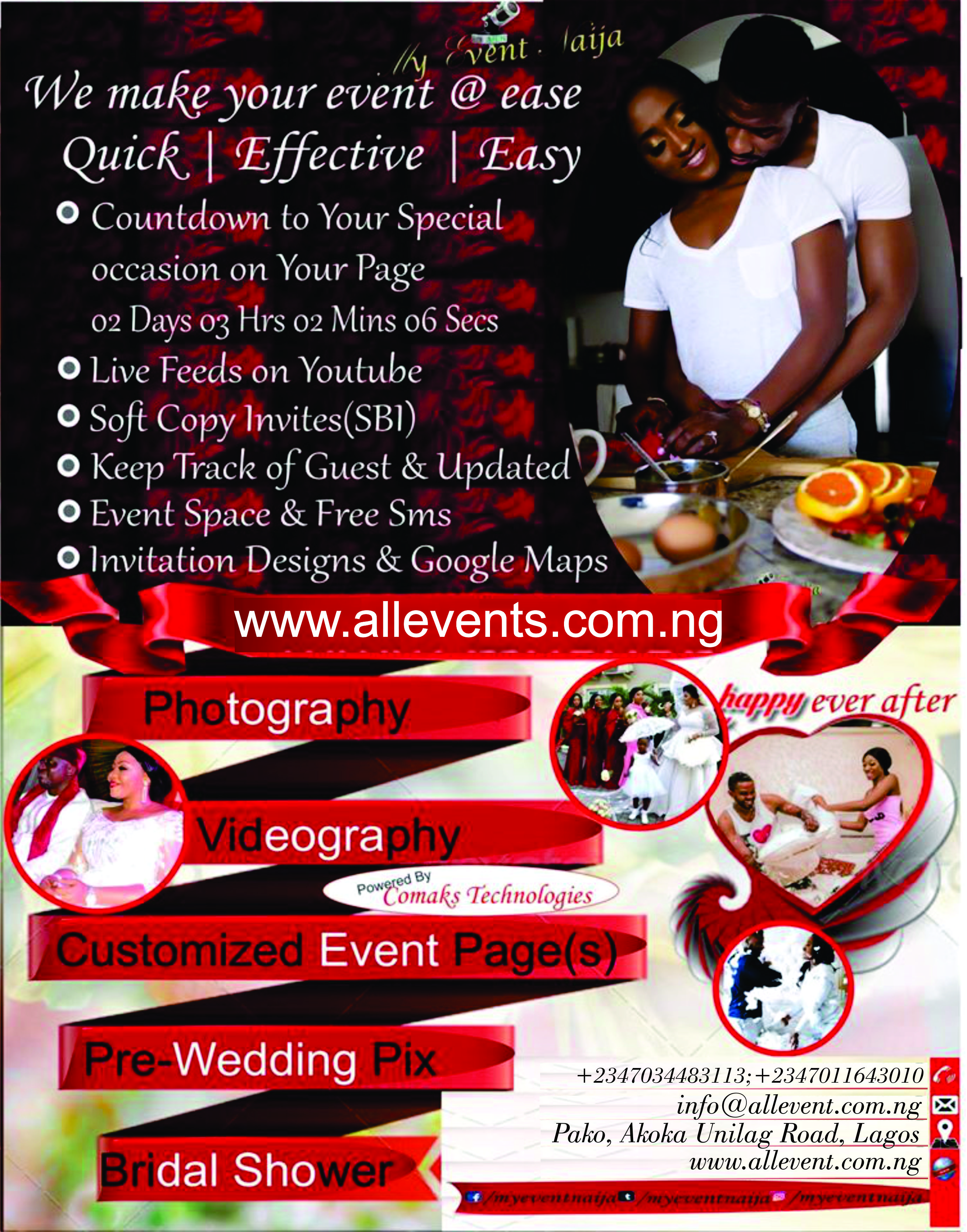 We help you develop a Customized Event Website, showcasing all your event deatils (Wedding/Event Pictires, Love Stories,
